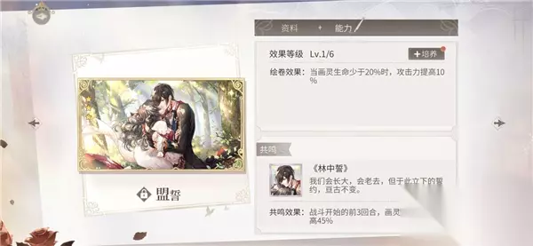 效果等级Lv.1/6 绘卷效果:当画灵生命少于20%时,攻击力提高10% 共鸣-《林中誓》 我们会长大,会老去,但于此立下的誓约,亘古不变。 共鸣效果:战斗开始的前3回合,画灵的暴击率提高45%