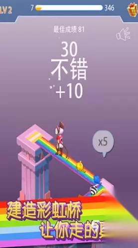一款跑酷风格的游戏,玩家操控一个小球,在赛道上持续滚动前行。游戏将玩家带入一个充满奇幻色彩的世界,玩家需穿越多变的场景,努力到达终点。游戏画面比较精致,音乐多样动听,还融入了社交功能和丰富的收集元素。提供多样的道具,让玩家在冒险过程中拥有更多选择和策略,大大提升了游戏的可玩性。模式自由开放,玩家可以尽情翱翔于游戏世界,享受飞行带来的无尽乐趣。 高速下载 普通下载 优先233乐园APP下载 2、《彩虹桥跳一跳》