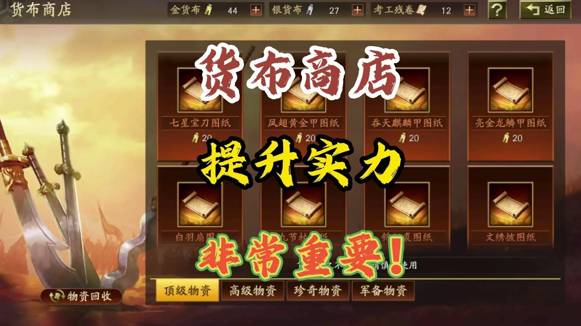 这是针对《三国志战略版》平民玩家的货布商店购物攻略,展示了货布商店的顶级、高级等物资栏的可兑换物品,如藏卷锦盒、各类武器图纸等,还提及可兑换对应特技,帮助平民玩家规划货布使用。