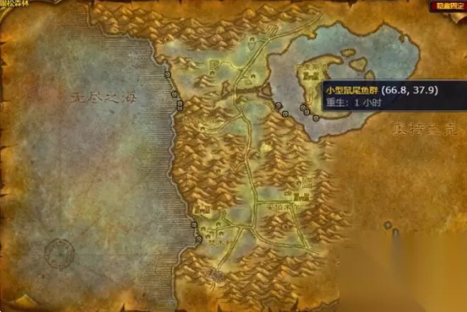 2、小型鼠尾鱼群:黑海岸、洛克莫丹、贫瘠之地、银松森林、西部荒野、幽暗城 注:以上两个鱼群中【新鲜的鼠尾鱼】获取概率都是85%。 洛克莫丹: