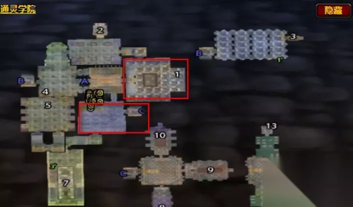 获取方法二:BOSS掉落 通灵学院的中的【伊露希亚·巴罗夫】、【讲师玛丽希亚】、【拉文尼亚】、【博学者普克尔特】都会掉落【暗影之皮】 他们的主要在下图中的红色方块内的房间内: