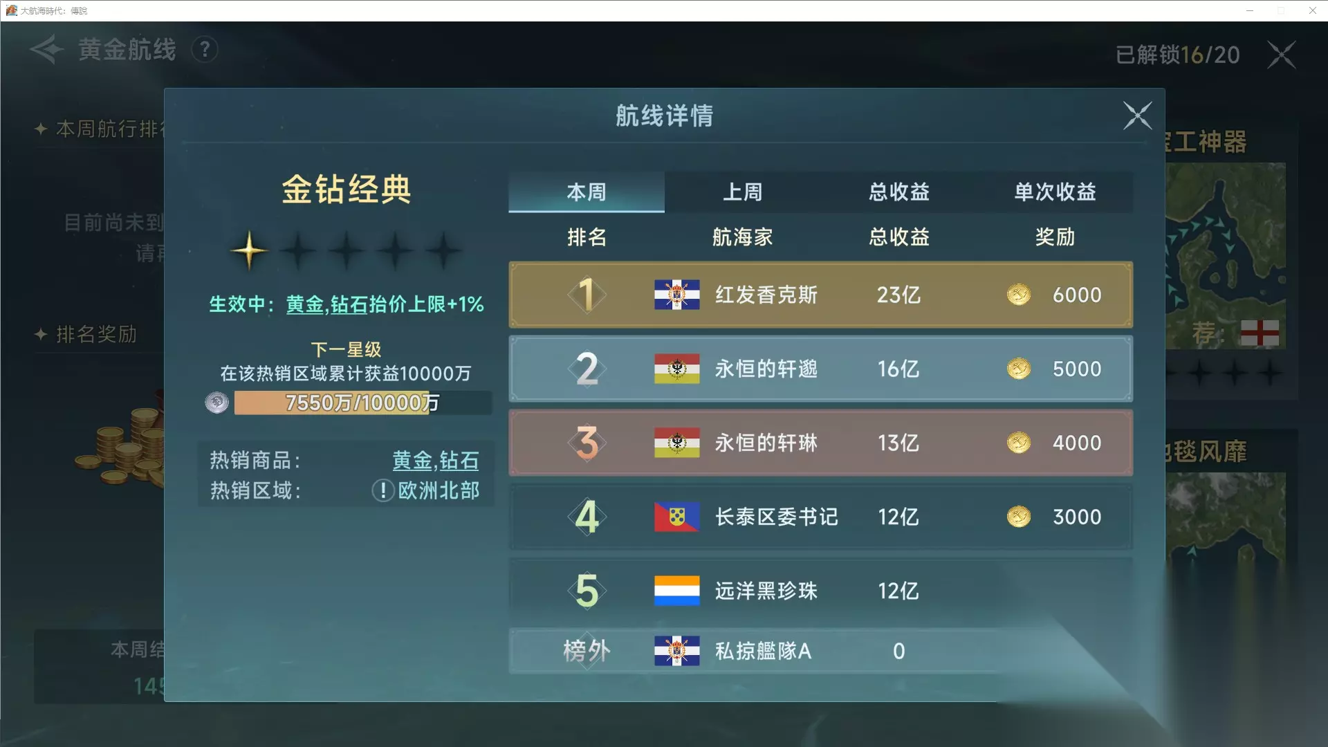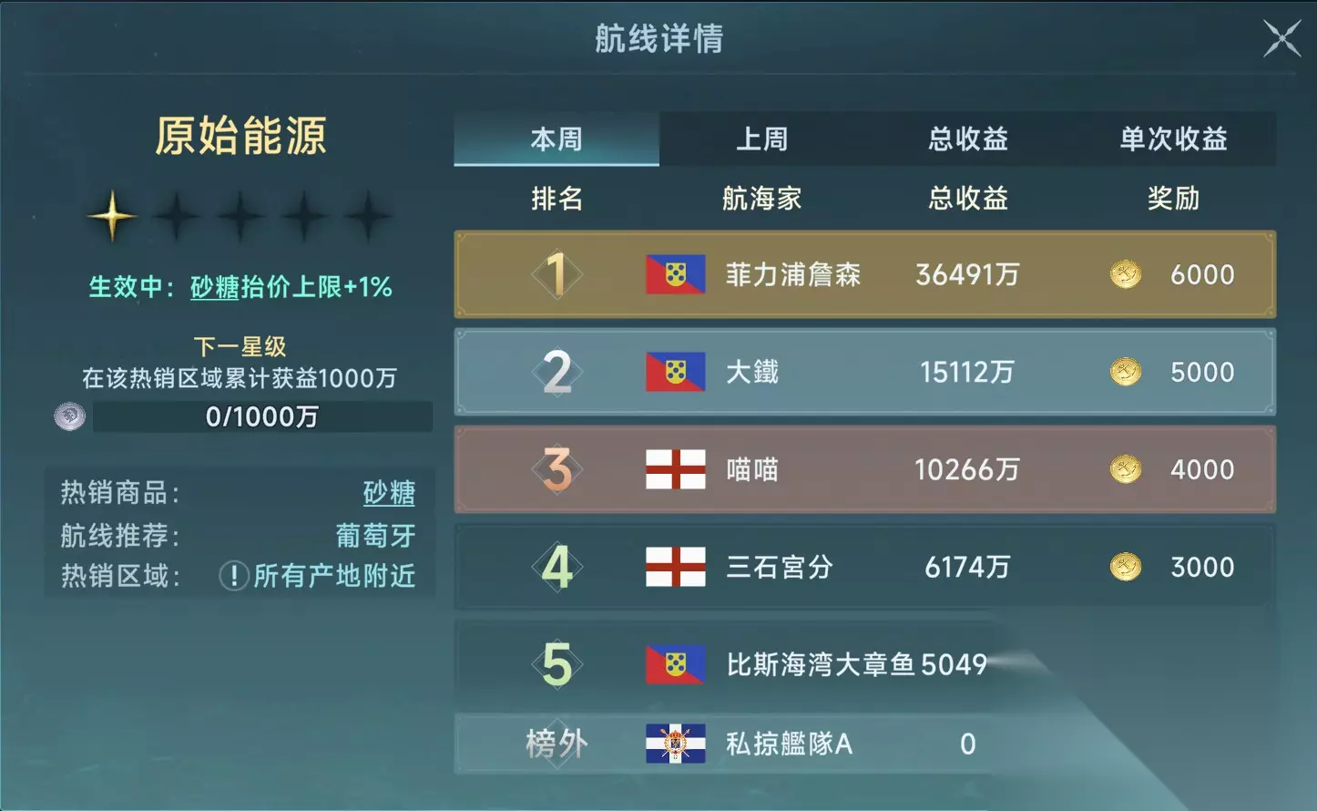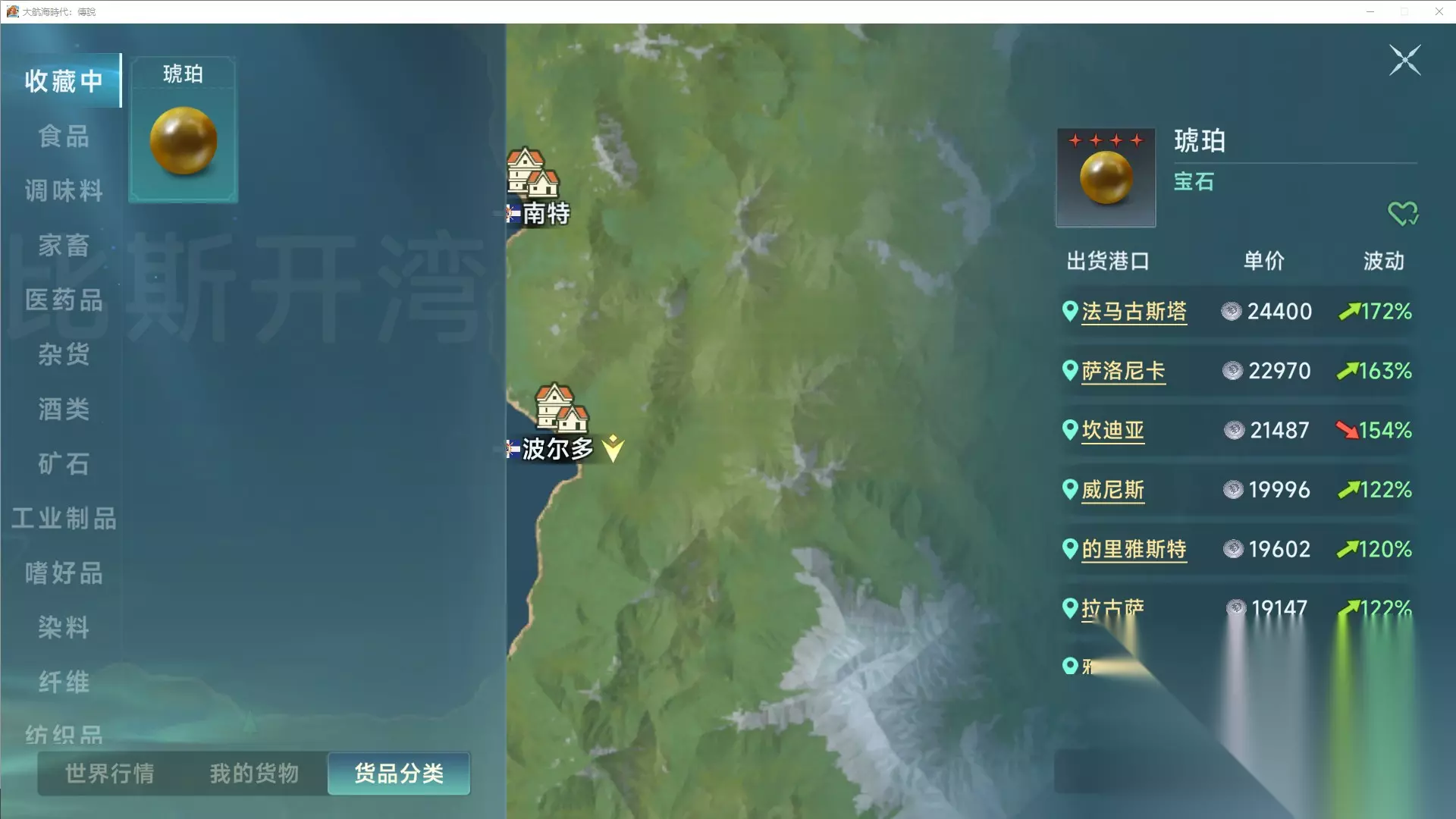 (2) 追求利润宝石流因为宝石在目前版本是最值钱的商品总类,无论是前期的琥珀,还是中期的钻石、珍珠,以至于后期的玛瑙、黄玉、蛋白石。太多可以赚钱的货物了,所以一直升级宝石的取引永远是不会错的。但是宝石产量很低,非常消耗星书,所以还是要量力而行,这种玩法只适合追求高利润和快速升级的玩家。本玩法前期推荐琥珀。因为追求快速升级,所以没有回程商品,全靠拖航。