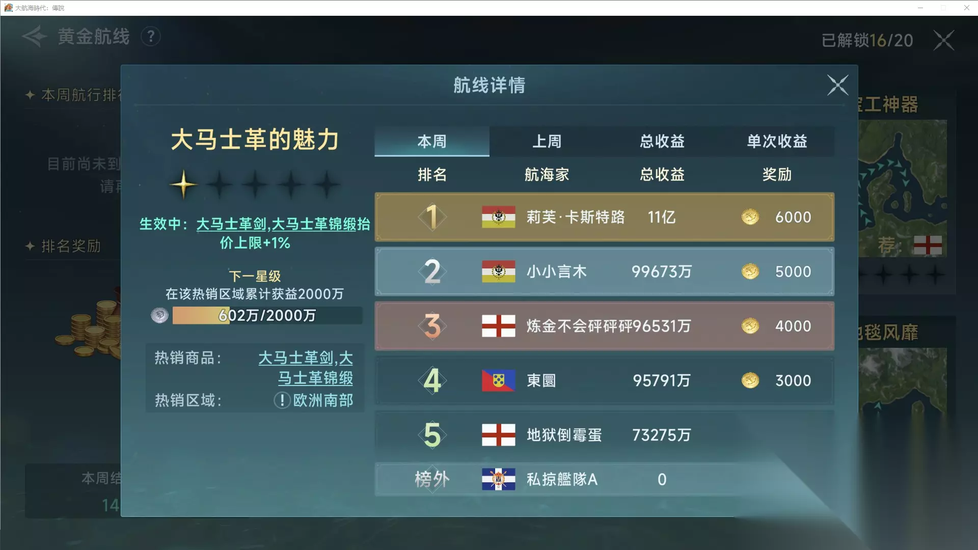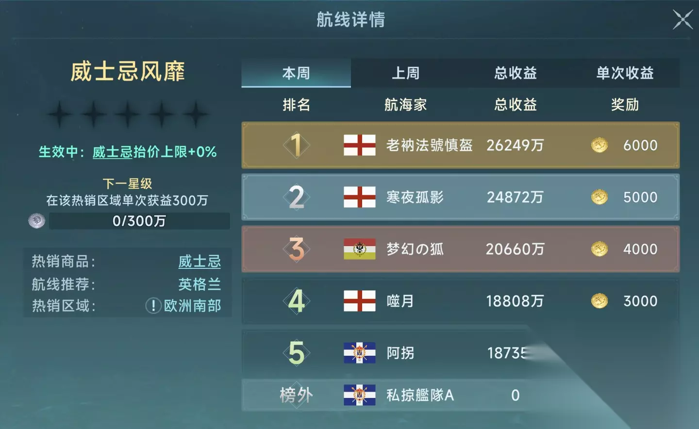 如果说跑商是一场战争,那么星书就是我们的弹药,有多少都不嫌多。所以在新手流行阶段,多多积攒星书,是最优的选择。 从商业25级开始,商路的选择就开始有变化了,根据你所解锁海域的入港证不同,也会有不同的商路可以供你选择。不过因为前期没有太多的选择,如果你综合等级没到60级的话,每个国家我都推荐先跑黄金航线,在升级的同时还能获得钻石奖励。 英国推荐威士忌