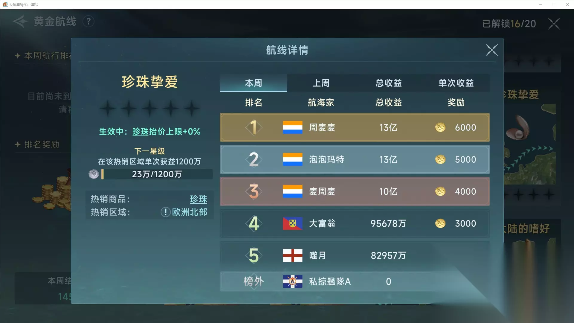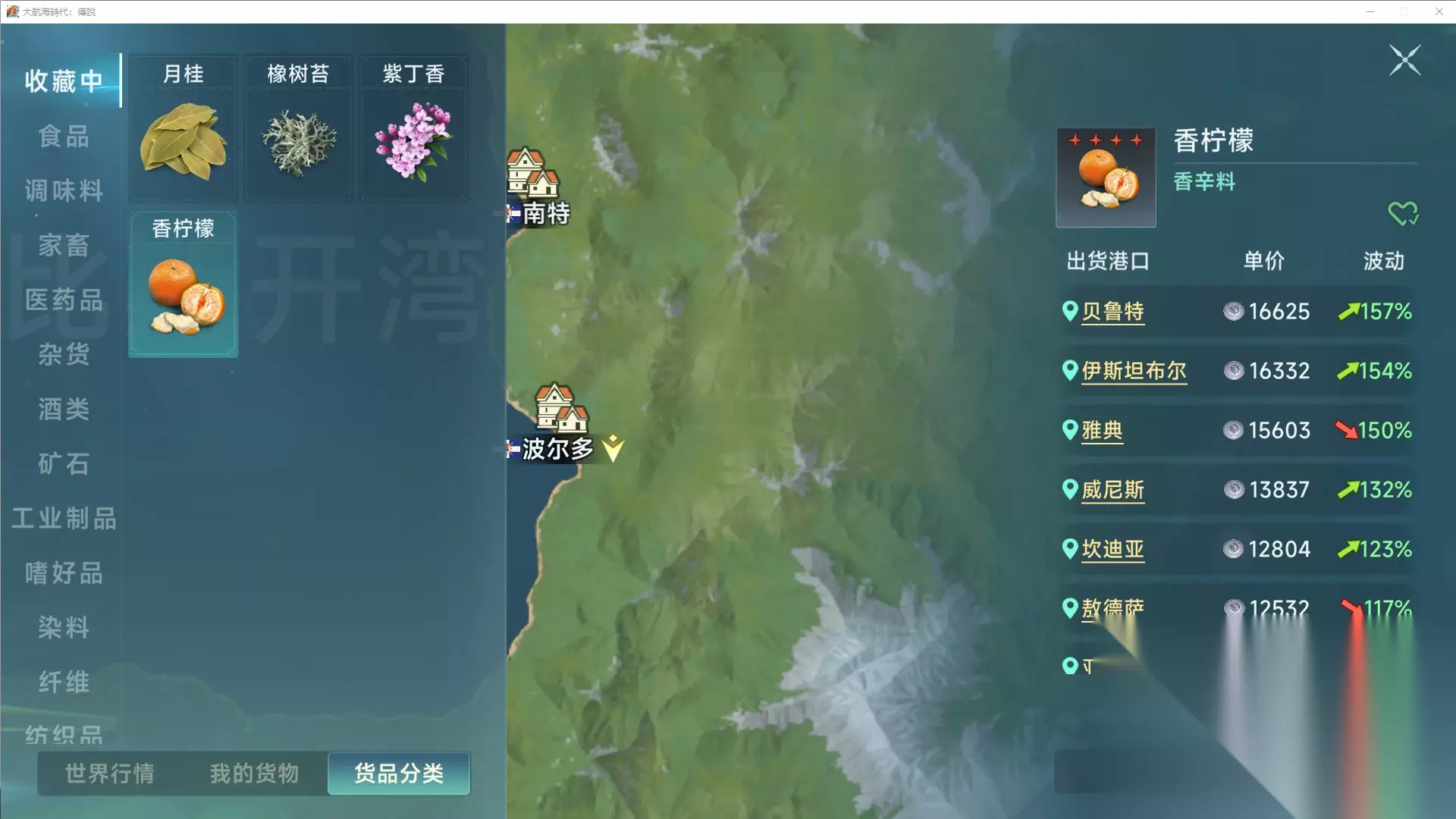 这三个都是路程比较近,利润还不错的商路。当然如果有好的暴涨或者流行,也可以去跑,这是完全不冲突的。 当你综合等级超过60且做完主线以后,整个欧洲的入港证你都解锁完毕了,根据后续玩法的选择,在这个时候已经有了3种推荐的商路选择。 (1) 简单轻松平拉流这个就是之前我推荐过无数次的,香柠檬/紫丁香-橡树苔/月桂叶,全部在安全海域,不会有玩家海盗的纠缠,星书消耗也少,是最简单的商路,非常适合休闲玩家。
