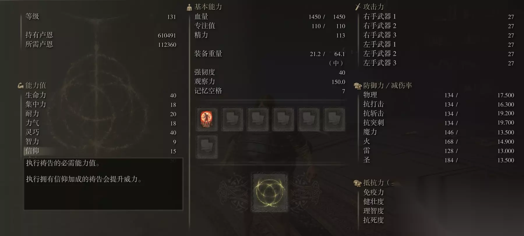 信仰流加点的核心在于优先提升信仰属性以最大化祷告威力,同时兼顾生命力与集中力来保证生存和续航。感应属性则根据后期是否使用龙飨祷告等需求酌情补充。初期建议将信仰至少提升至30点,以解锁足够多的基础祷告,生命力维持在20-25点提供基础容错,集中力则需15-20点来确保有足够的蓝量释放技能。