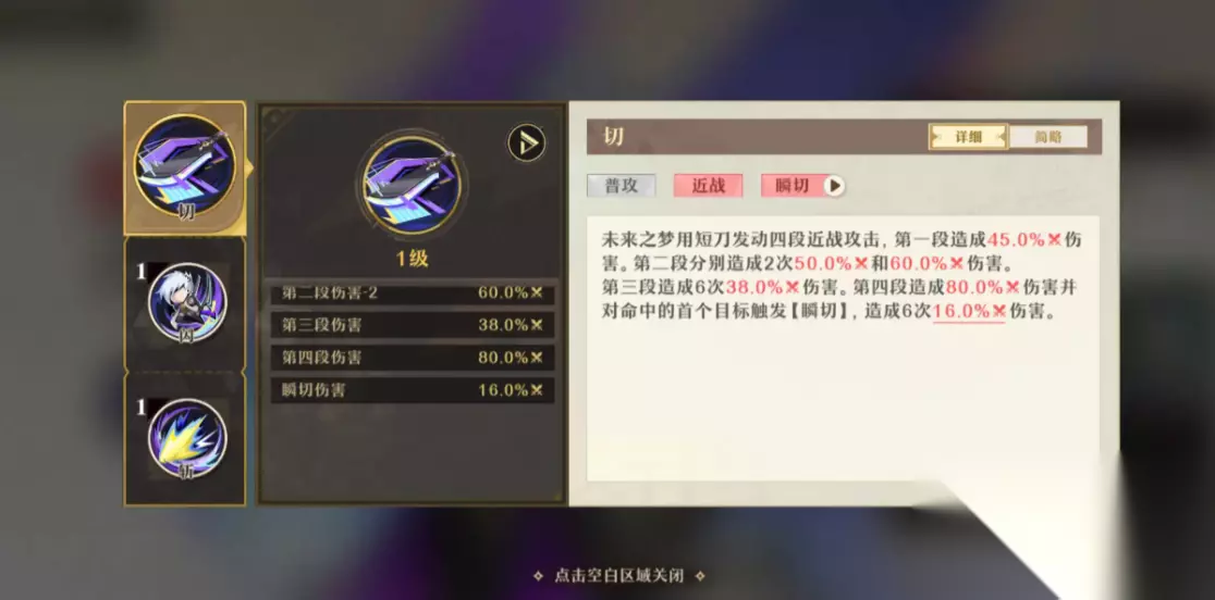 技能分享 在游戏世界中,未来之梦以一把长刀作为武器,掌握着四个技能。其普通攻击分为四段,是一种近距离的战斗方式,不仅具有扩散效果,还能造成区域伤害(AOE)。第二技能是一个锁定单体目标的追击技,能够穿透敌人的护甲。而第三技能,作为大招,能够对指定目标进行精准打击,在此期间角色将处于无法被击中的霸体状态。未来之梦的输出能力极为强大,尤其是其点杀能力,但操作起来颇具挑战性,需要玩家熟练掌握闪避与技能的组合使用。