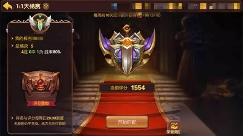 玩家通过点击开始匹配按钮即可以进行玩法。每周评分到达一定程度的时候,玩家都可以到评分奖励宝箱里面领取对应的评分奖励。玩家能通过点击对战记录按钮查看自己所参与的战斗的详细数据,了解自己的胜率,尤其是对应职业的胜率显示,能方便玩家了解自己的薄弱面,同时针对对应职业进行强化练习。点击排名奖励按钮,能查看各排名段的每周结算奖励。 玩法规则介绍 玩家们每天可以无数次参与玩法,进行匹配挑战,并获取奖励。玩法匹配系统会按照玩法内显示的匹配规则来为玩家匹配对手。匹配成功后即开启战斗,玩家需要在规定时间内击杀对方才能获得胜利并提升自身评分,没有击杀则算平局不影响评分,而失败将会扣分。同时,评分会在每周日晚上八点都会重置的。因此,希望玩家需要每周都进行多次对战,磨练技术,争取在每周日八点前打上更高的分数,获得更多的荣誉点奖励。 玩法奖励介绍 1V1天梯赛玩法中主要的奖励是荣誉点以及金币,荣誉点可以用于在荣誉商店处购买商品。商品主要包括时装套装,竞技场宝箱以及宠物饲料。玩法奖励的荣誉点的主要来源于以下三项: 对战奖励:战局中战斗胜利时所获得的荣誉点奖励,每局荣誉点奖励的数量根据敌方评分与自身评分的差距而定。同时每周会有10次额外获得荣誉点的机会。
