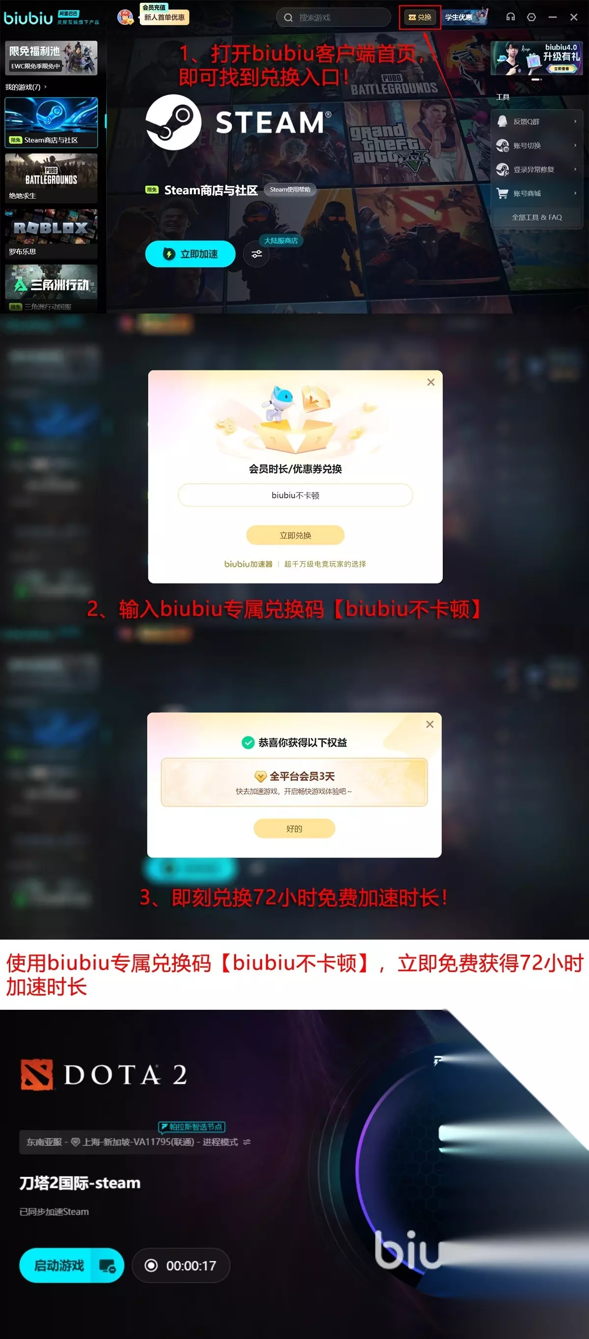 大家不要觉得这个平台功能强大,价格就一定贵,其性价比也是很优越的,对于新用户,首次注册之后,大家能够直接额外得到24小时全功能免费试用权限,所有游戏在此期间都可免费为大家提供加速服务,另外,老玩家也可以凭借【biubiu不卡顿】这一兑换口令,再额外获取72小时的会员免费加速时间。这样也能确保新用户最多拥有96小时的免费体验机会,有足够多的时间去了解平台,没有多少限制,只要口令输入正确即可快速领取。
