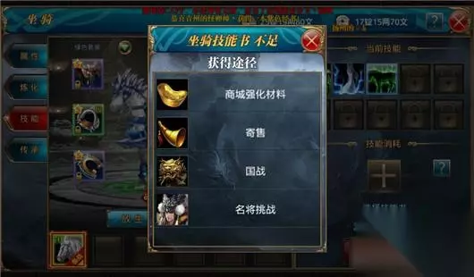 [坐骑技能] 马匹最多可以获得10个技能,学习技能需要消耗马匹技能书,需要注意的是学习新技能的时候,是有几率代替现有技能的。马匹技能书的获得途径有:金券商城花费500金券购买一个初级马匹技能书、2000元宝购买中级坐骑技能包、8000元宝购买高级坐骑技能包、寄售购买、国战和名将挑战玩法奖励。