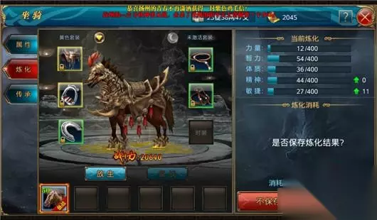 《御龙在天手游》有了高品质、高属性的二代马匹后,还要通过坐骑炼化、学习坐骑技能、打造升星坐骑装备等操作进行培养。随着玩家等级的提升,在获得更高等级的坐骑之后,玩家要通过坐骑传承来将炼化属性和学习的坐骑技能传承给新的马匹。 [坐骑炼化] 消耗其他马匹,可以对主马匹进行炼化,增加马匹属性的绝对值,马匹炼化不影响成长值。在坐骑界面点击炼化,在左侧+处选择一个马匹,点击炼化后可以看到属性值的变化,如果属性上升,则可以选择保存。使用炼化水晶属性必定增加,炼化水晶可以通过家族养马玩法获得,也可以用250元宝在强化材料商城直接购买。