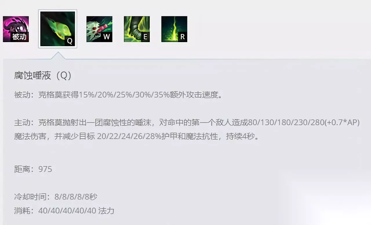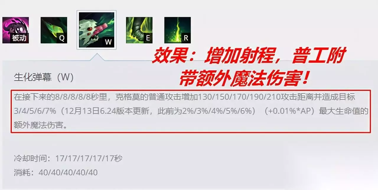 Q技能是大嘴对线期非常好用的技能,被动提升攻速,主动效果提供双穿属性,这个效果完美地契合了大嘴W技能,前文说了大嘴的W技能造成的就是混合伤害,不仅有基础的AD伤害,还会附带额外的魔法伤害,这种特性配合Q技能的双穿,能够大幅度提升消耗能力,加强消耗效果。 2、线上对拼:用好E技能的限制效果。