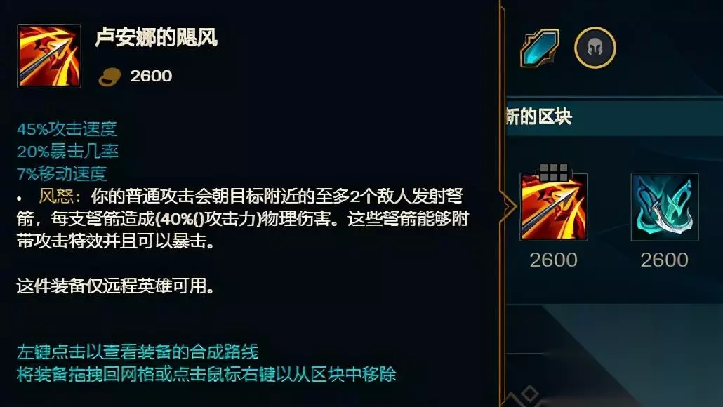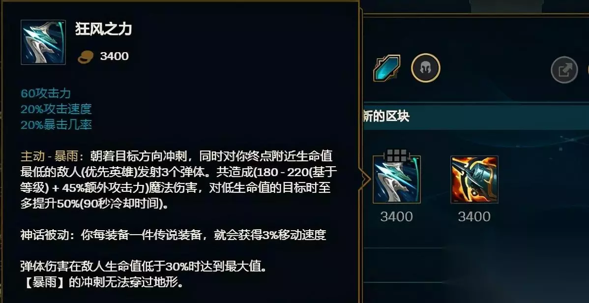主要还是【狂风之力】的主动效果,所提供的这一小段位移非常适合大嘴,不要轻易使用这件装备来追击敌方,最好是用来保命,能够在很大的程度上保障自己的安全,增加自己的输出机会,这是很重要的。 第三件装备怎么选? 没有其他选项!只有【绿叉】!有人说【飓风】也是个不错的选择,但是在这个版本,还是绿叉最合适,为什么这么说呢?请大家看下图: