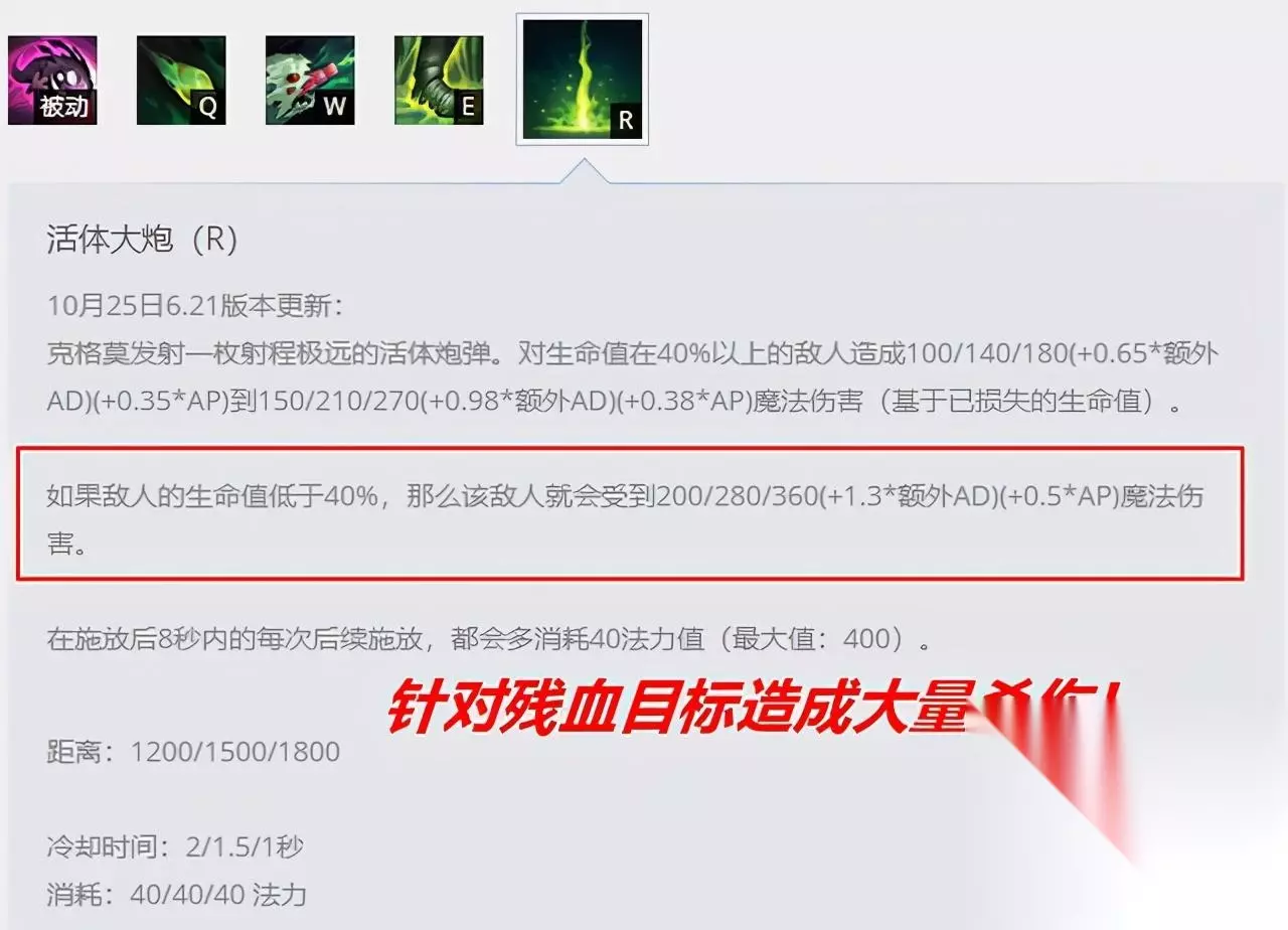 大嘴的E技能本身还是有一定的伤害的,但是最有用的还是这个技能的限制效果。20-52%的减速效果,在对拼的时候非常有用,大嘴的常用对拼策略就是利用E技能的减速效果和W技能射程增加,另外再配合上Q技能的攻速提升以及双穿效果,在这波对拼中打出爆发性的伤害来。 这一点需要大家好好练习,尤其是Q技能的命中率,以及走A的熟练度,利用走A打出W技能持续期间的伤害,这是很关键的,也是大嘴最难的地方。 3、团战收尾:用好R技能的斩杀效果。