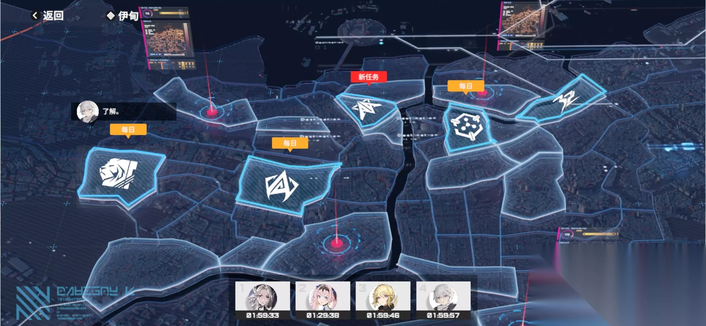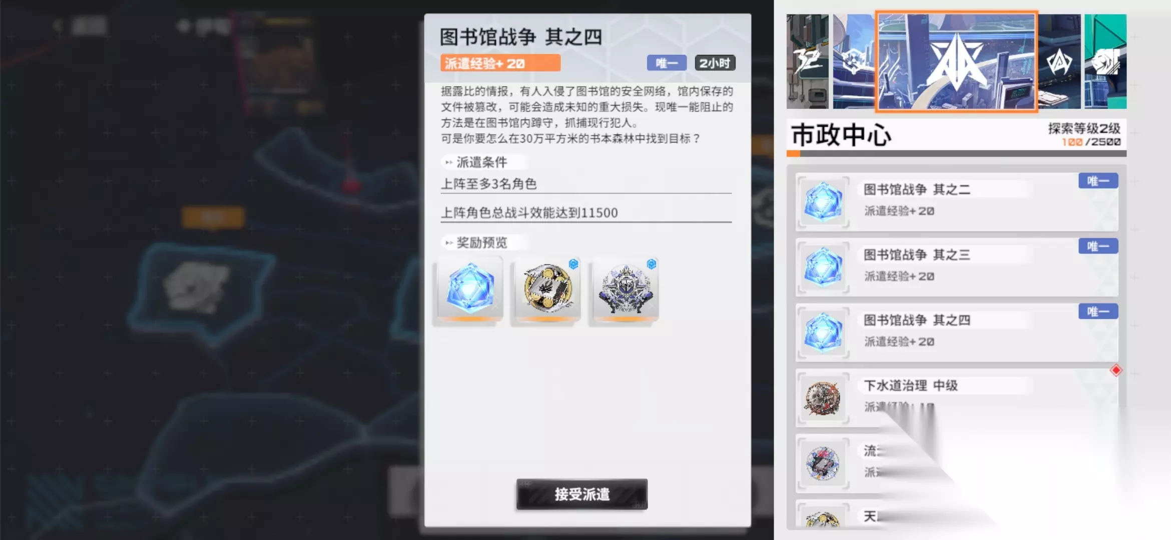 【每日派遣】 各地区每日任务2小时给80经验,这些任务必做。其次所有队伍都去挂机“市政中心”8小时派遣,3天就可以到达2级。之后再挂机就可以获得金色模块。