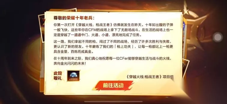 【老兵任务】 12月6日起,大家不仅能领到期待已久的皮肤和称号奖励,还有“老兵任务”同步上线,为各位奉上更多福利!荣耀/传奇十年老兵完成任务可赢取额外限定奖励;淬金枪战王者需与已绑定的“传奇十年老兵”共同完成指定任务,方可领取对应任务奖励。 【结语】 十年不是终点,是新的起点。从2015到2025,CF的世界因每一位玩家的参与而鲜活。无论是“荣耀老兵”的坚守,还是“淬金王者”的热忱,都是这款游戏最珍贵的财富。下一个十年,愿我们依然能在CF的战场相遇,以枪为证,以兄弟之名,续写新的传奇。