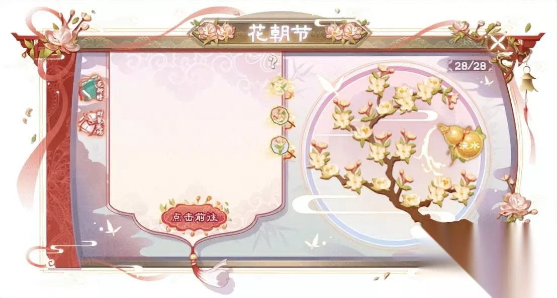 活动奖励:名列榜首的玩家可于活动结束后在花朝节-花神榜界面领取“典藏·花神”道具,使用后获得2023年度【花神】永久图片称号。 注: “花神榜”将于2023年3月14日20:00后获得花神值将不会增长。 “典藏·花神”道具仅可于2023年3月14日20:00-2023年3月22日24:00期间领取,请各位榜首及时领取。 【培育·迎春花】 活动时间:活动期间全时段 活动参与:“花朝节”界面 活动介绍:活动开启期间,玩家可于“花朝节”界面点击“培育”使用“迎春水滴·2023”来使迎春花之种花开满枝,当28朵花全部盛放之后,玩家可获得“花神的馈礼”。 “迎春水滴·2023”可于花朝节活动及花神使者处使用花神印·银兑换获得。