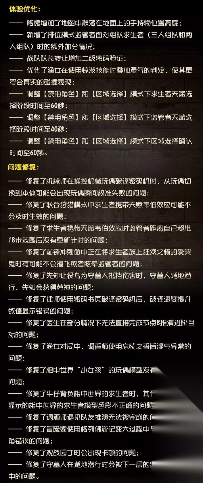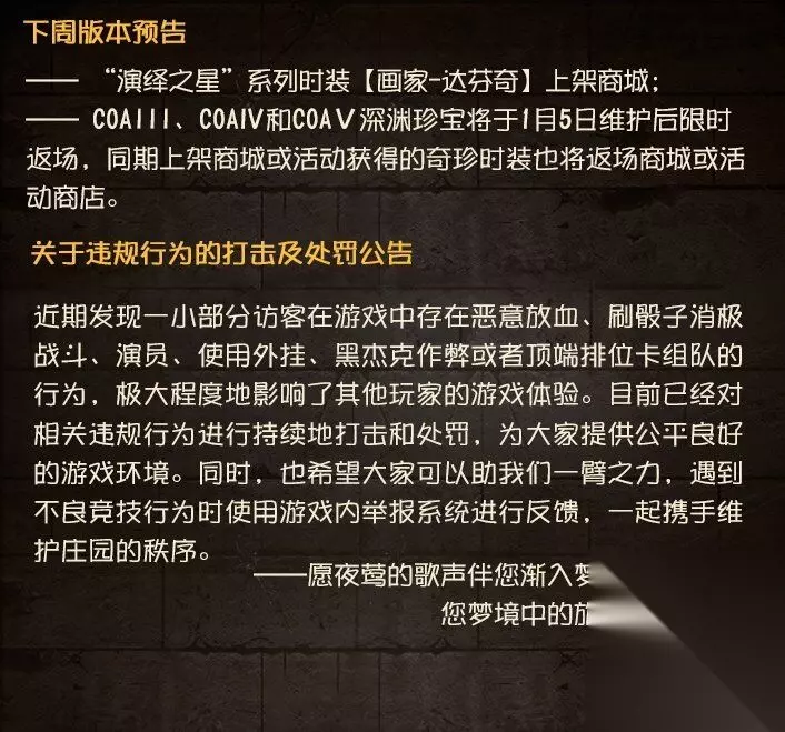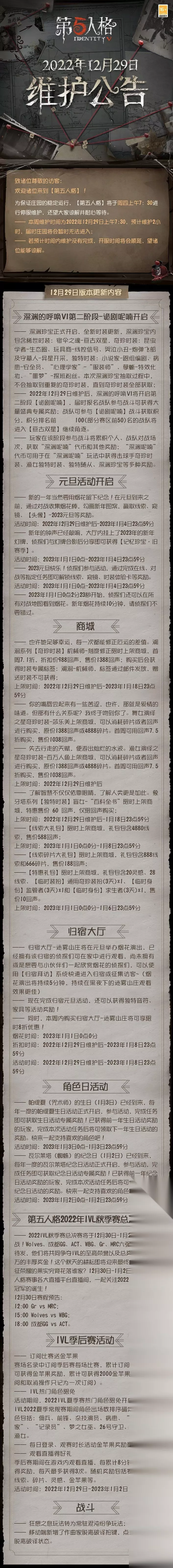 第五人格12月29日更新维护了什么 2022年12月29日: ——深渊的呼唤Ⅵ第二阶段 - 诡剧呢喃开启; ——元旦活动开启; ——溯洄系列【奇珍时装】机械师-刻度修正限时上架商城; ——舞女演绎之星奇珍时装-莎乐美上架商城; ——渔女演绎之星奇珍时装-百万人鱼上架商城; ——象牙塔系列【独特时装】盲女-“百科全书”限时上架商城; 更多内容请点击长图了解~ 注意:本次更新之后部分烟花棒勾画任务存在体验问题,目前已在优化调整中