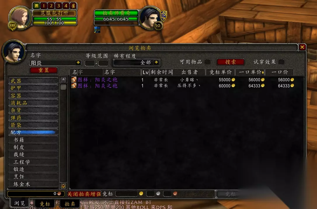 这是一些在副本中拍卖掉的阳炎之袍图纸,这个团3万金起拍,一路顶到了45000金。不过这个价位并不高,卖得比这个贵的图纸还有很多。