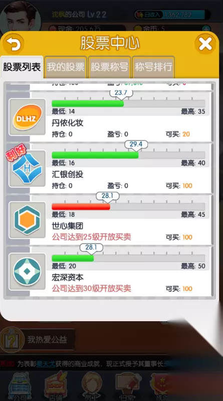 第二、股票引导任务一定要做,不然你买不了股票,但是股票引导任务别买多了只买1份股票不是100份,后期到20级后再买股票。(顺便说一句买股票只买股票界面中你能买的最后那一只股票,因为那一只的高低差最大,挣钱最多也最容易)。