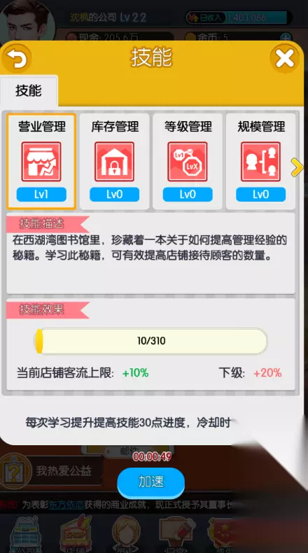 3、 主角技能:有技能后点一下主角的技能,重点研究是第一个技能营业管理,前期比较重要,能让你每次升级后公司收入的比别人多很多。