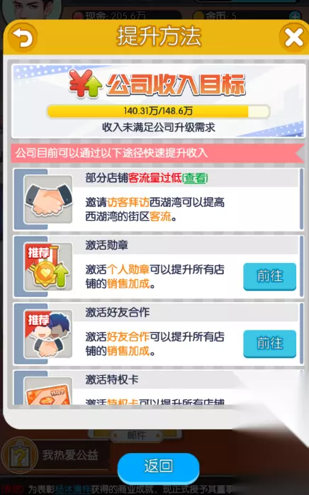 4、 公会:16进入进商会不要急着捐款,要商会的加成就好,20级以后有详细介绍。 5、 员工:招聘时记得只招募二星以上员工,用于店铺等级提升到4级和任命店长。员工尽量选择高星级高悟性的。 10-20级:这个阶段升级比较麻烦 1、预收入:13级开始预收入比较卡壳,因为大部分店铺店铺流量还是超标变为红色,升级的时候找客流超过上限的升级,这样提升的预收入比较高,如果客流还没到上限,花几十上百万升级预收入可能只会提升4、5百预收入,普遍2级,7、8个3级商铺基本就够了。这个阶段开始注意商会了,土豪的商会这时候已经升级到3级甚至更高,如果你运气不错在前3名的商会里面注意一下会长、常务、副会的捐献,如果1000左右要有换会的准备,超过3000可以多待一段时间,5000以上的这个商会基本没问题了。公司收入是公司升级的主要要求方式,尽量提升公司预收入。