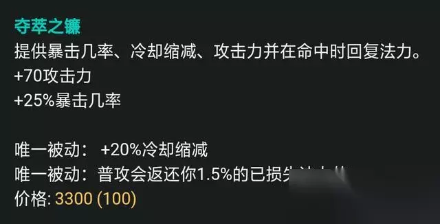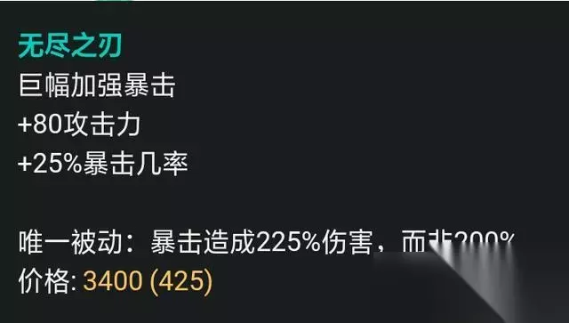 提供70点攻击力,25点暴击几率,同时增加了20点冷却缩减,普攻返还法力值。 高额的攻击力加成提高让厄运小姐的输出,最为重要的是该装备拥有20%的技能冷却缩减,由于厄运小姐的大部分伤害都大来自招,但前期的冷却时间较慢,20%的CD能够减少大招冷却时间。 无尽之刃