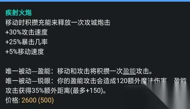 在前不久的版本中,无尽之刃的暴击伤害从200%提升至225%,一波小小的加强,80点攻击力加成,进一步提升了厄运小姐的输出能力,暴击伤害提升能打出更多的伤害。 疾射火炮