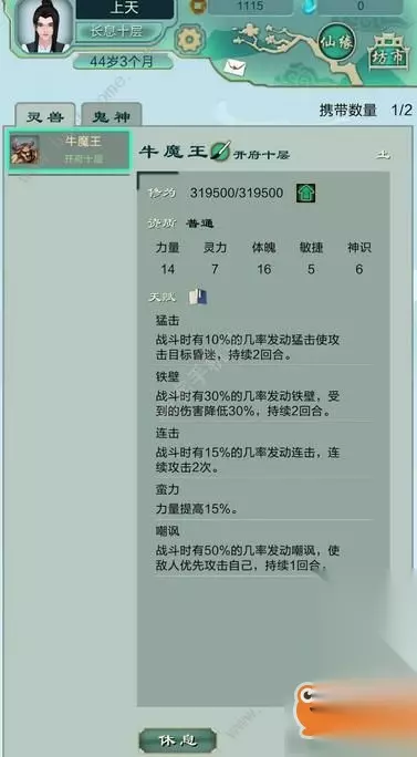 这是上次内测留下的牛魔王,中间刷了几次技能,建议一定要抓个体魄高的牛魔(15以上)