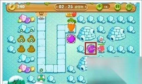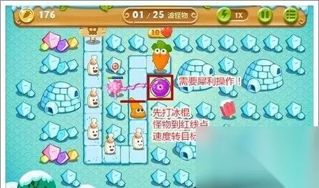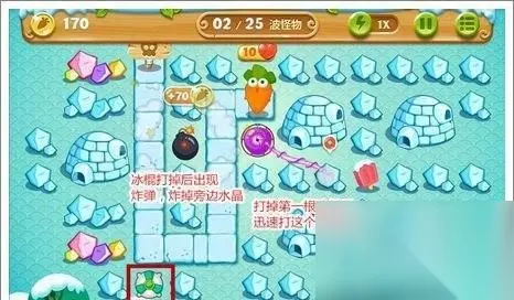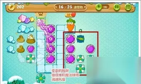 清理完第一波怪物后,在红色方框处放置一个减速风扇,并提升等级来分担压力,魔法球塔则第一时间打掉第二根冰棍左边的水晶。注意:这里的魔法球塔打不到第二根冰棍。另外值得提到的是本关内的红色冰棍打掉后会出现炸弹,炸弹能炸掉旁边的场景道具,获得一些防御炮塔,帮忙玩家过关!