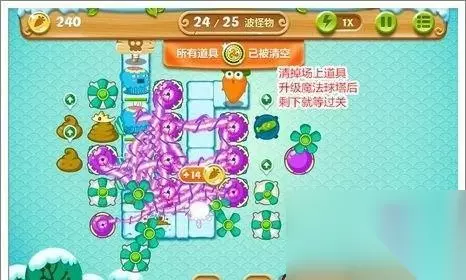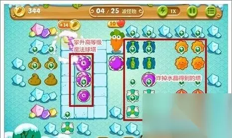完成冰棍任务后,玩家要用攒到的钱迅速在中间放置3个魔法球塔,并攀升到高等级,因为此时游戏的小怪血量和数量变大,需要的防御塔在短时间内打出高伤害来清除掉。右边炸掉水晶掉落的塔,则要同时用来清除场上剩余的水晶。 右边的水晶清除完后,就把没用的炮塔全部卖掉,然后升级魔法球塔。