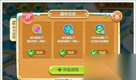 1、成功建造8个魔法球塔(顶级)。 2、成功建造2个减速风扇塔(顶级)。 3、60秒内清除2个红色的冰棍道具。