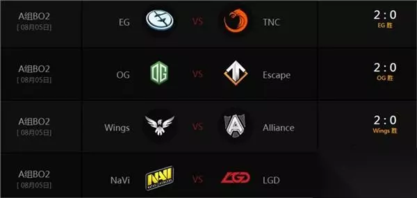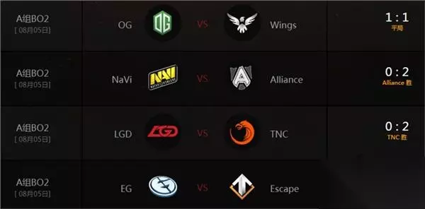 首轮比赛,Wings和OG进行了两场60分钟大战。第一局Miracle无解肥敌法师在中期没能一波打崩Wings,后期Wings卡尔DOOM成型,渐渐把握住战场的主动并最终拿下比赛。第二局Wings犯了和OG第一场一样的错误,shadow的无解肥斯温在中期装备选择上出现失误,面对天堂哈斯卡迟迟不出金箍棒,最终在前期优势的局面下被OG翻盘。 东南亚黑马Tnc战队在首日击败Wings后,今天面对LGD再次以2比0拿下比赛。NaVi和Alliance的冤家对决最终以A队2比0取胜告终,EG面对A组经验宝宝Escape毫不犹豫地拿下两分。