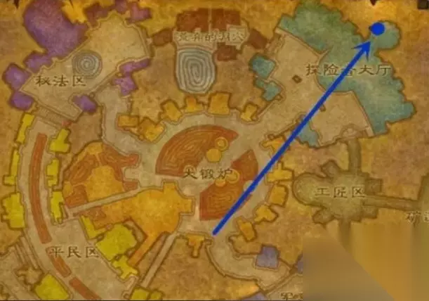 2、找到NPC塞伊·普雷斯勒,该NPC可以触发兮兮的戒指任务。 3、来到铁炉堡的探险者大厅 ,坐标74,9附近,图中蓝色点位置。