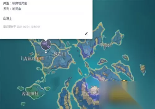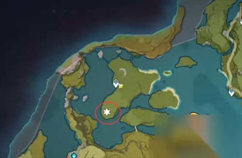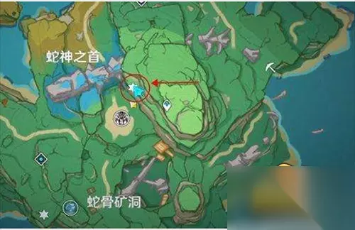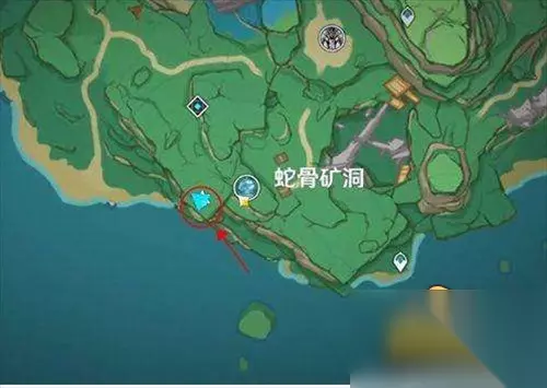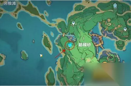 二、稻妻地区 稻妻地区有7个,分别是在踏鞴砂、踏鞴砂左边、踏鞴砂左下方、离岛西北方向的小岛、蛇骨矿洞左上方、蛇神之首机关魔偶旁边一个和清籁岛山坡上一个。 具体位置图 1、离岛西北方向的小岛上一个。