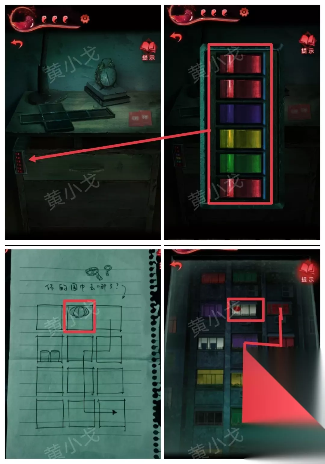 12.点击书桌抽屉上的密码锁,根据在卧室看到的对面楼线索,结合【纸条】背面的线索,调整密码锁 顺序:从上到下-红红紫黄绿白 方框对应对面楼窗户的位置;箭头表示顺序(根据灯笼图案找到对应的位置)