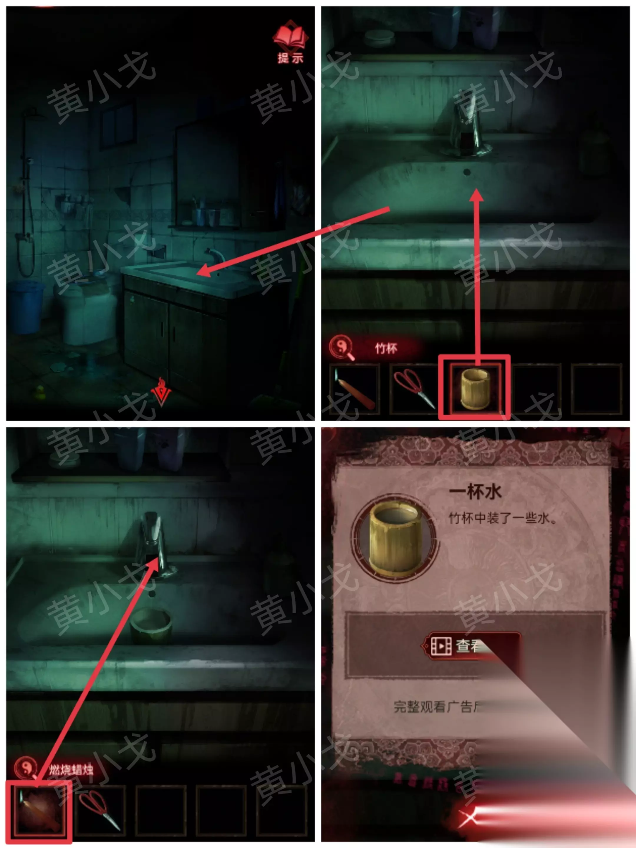 ……✄……✄……✄……✄……✄…… [卫生间] 34.点击洗手池,把【竹杯】放入水槽,用【燃烧蜡烛】感应水龙头出水,获得【一杯水】
