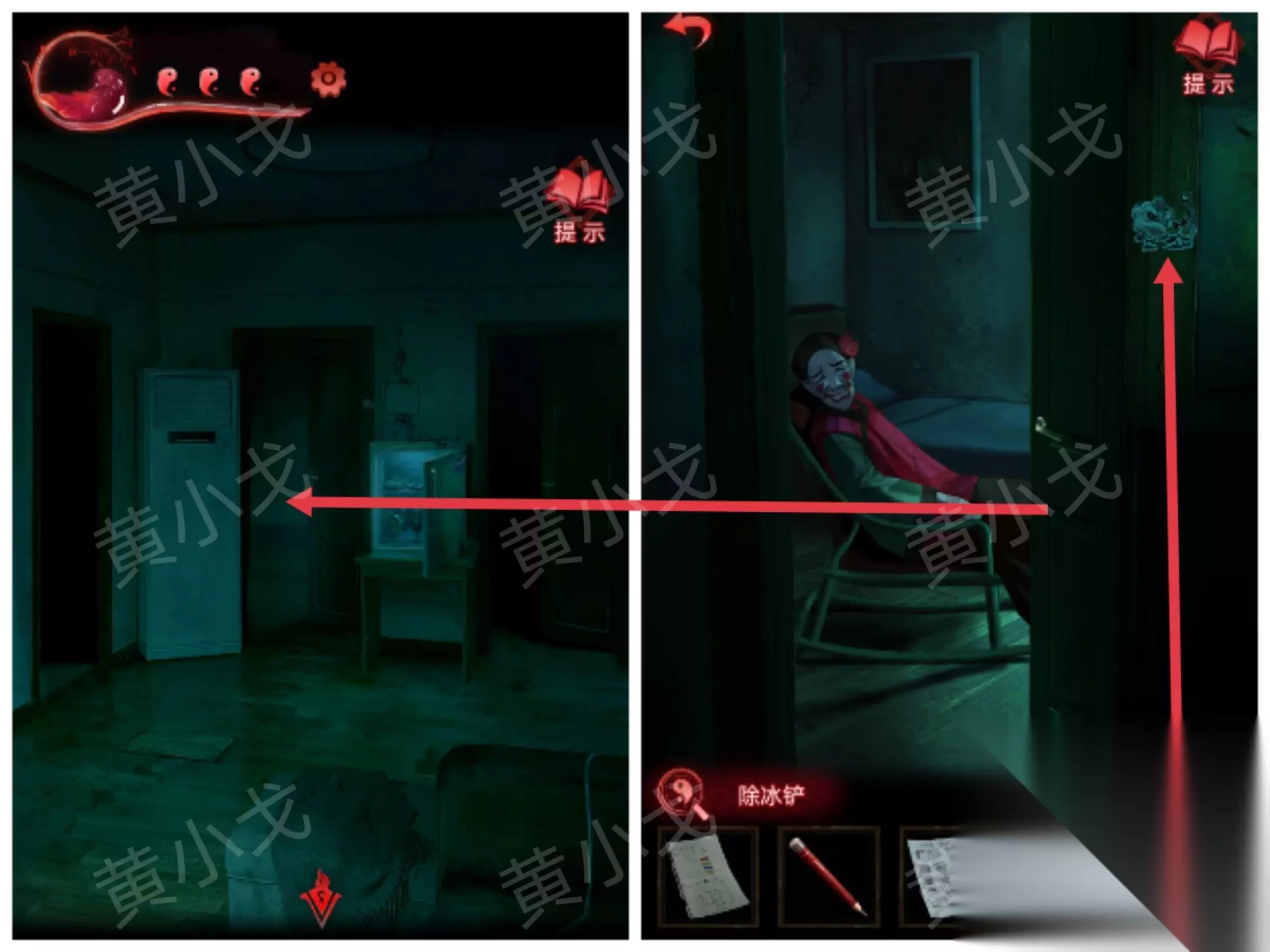 8.点击中间房间的门,用【除冰铲】铲掉门上的狮子贴纸