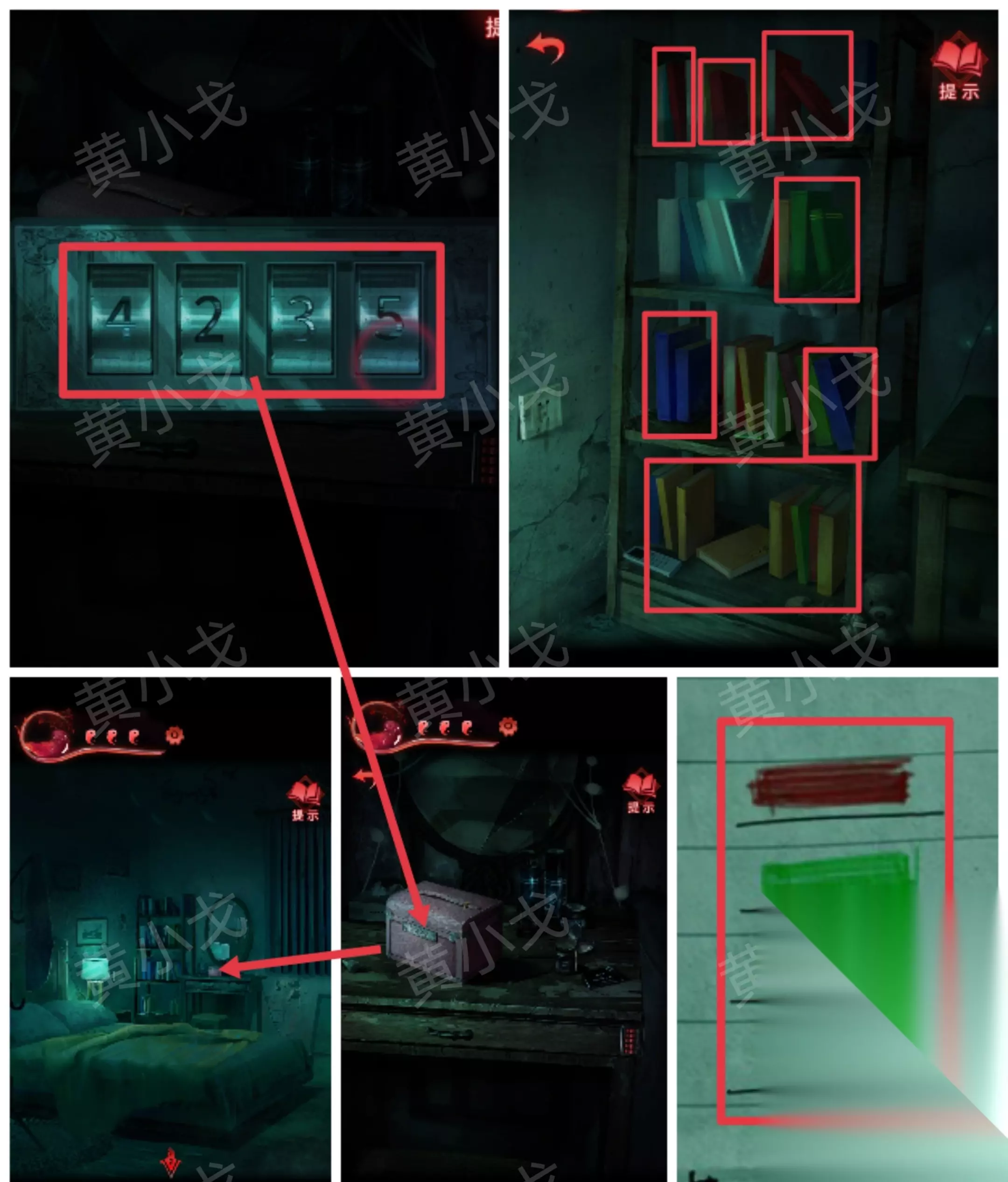 2.点击梳妆台上的化妆盒,根据【纸条】上的线索,结合书架上书的颜色及数量,输入密码:4235 【纸条】上的线索:红绿蓝黄 解谜思路:书架上的第一层红色书本数量-4、第二层绿色书本数量-2、第三层蓝色书本数量-3、最下面那层黄色书本的线数量-5