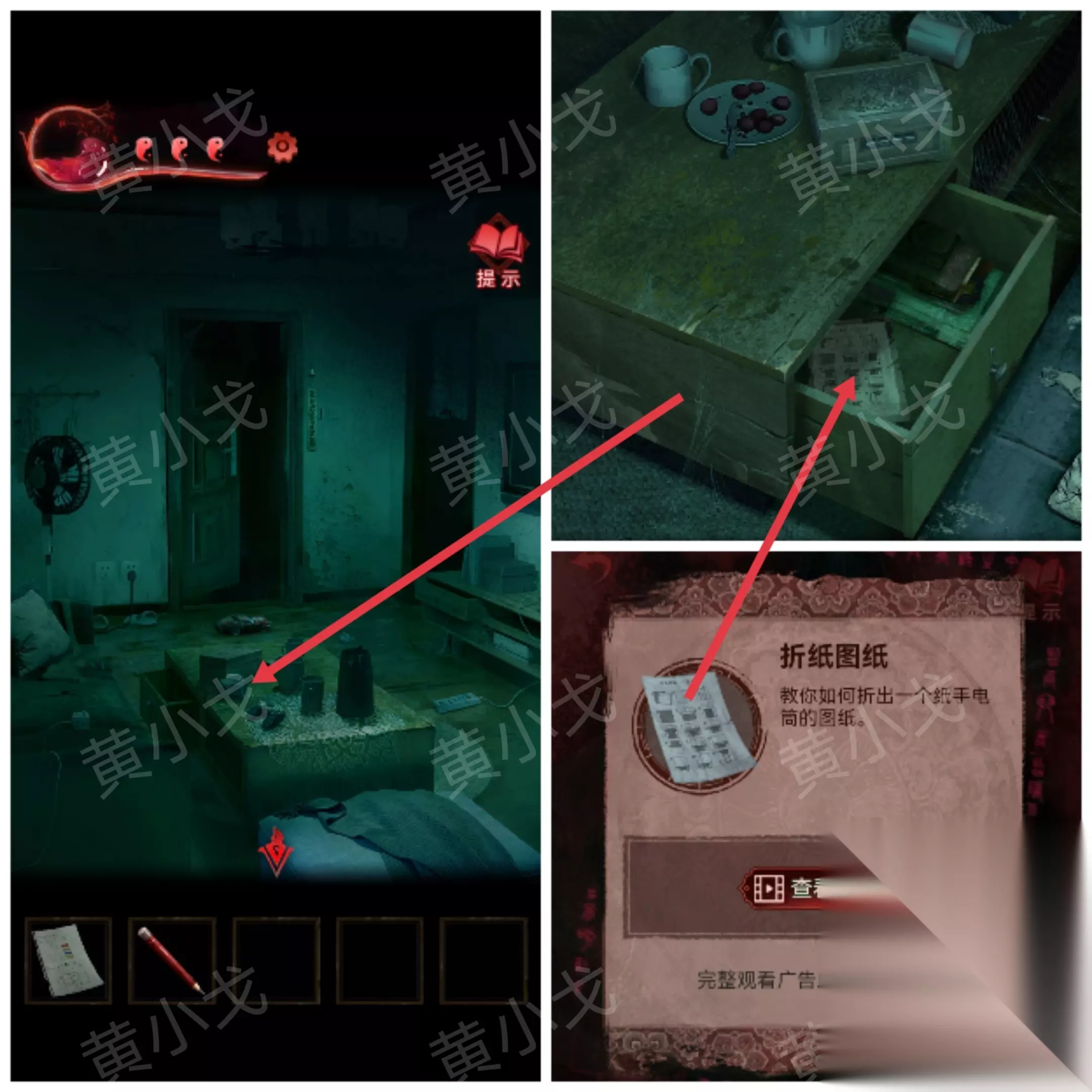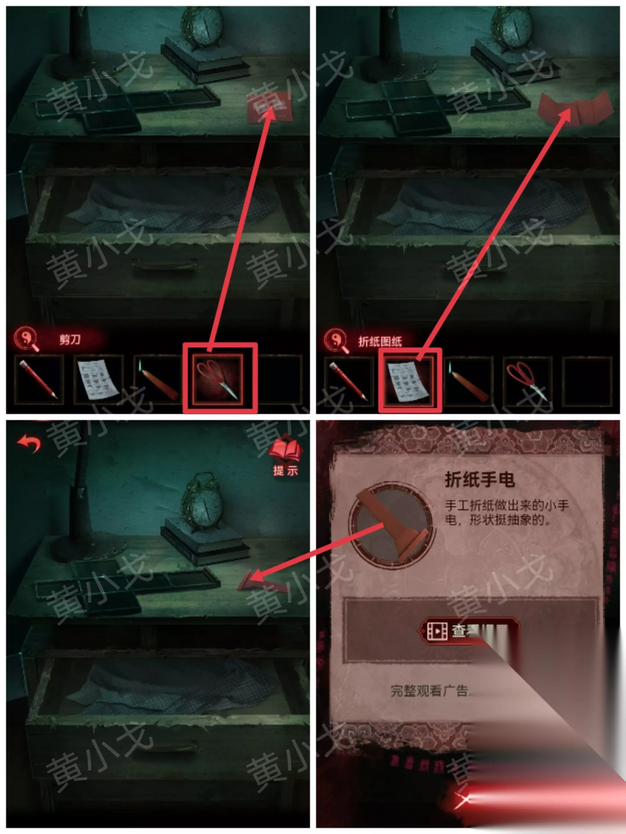 ……✄……✄……✄……✄……✄…… [书房] 24.点击桌子,用【剪刀】剪开红包;使用【折纸图纸】,获得【折纸手电】