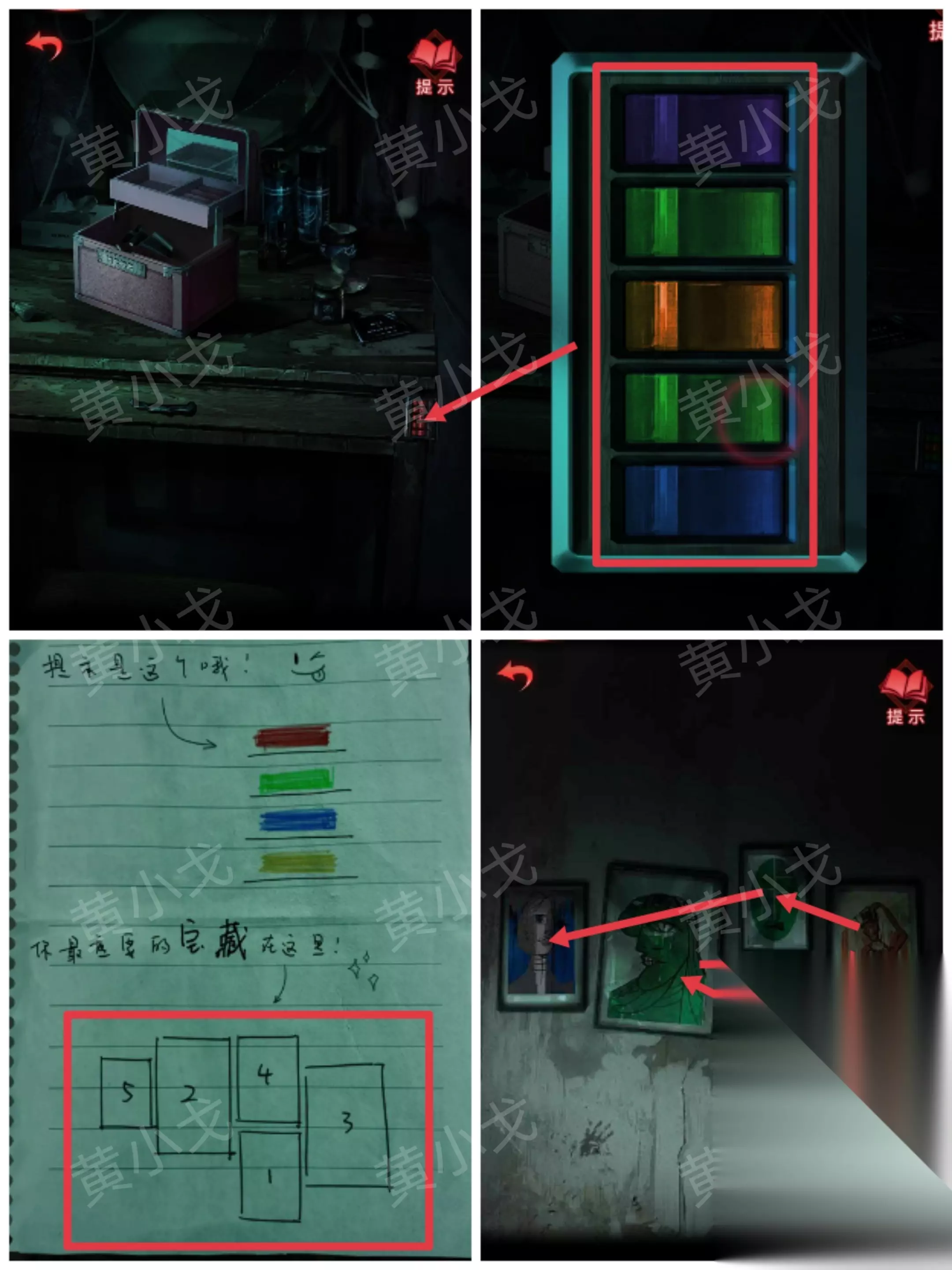……✄……✄……✄……✄……✄…… [卧室] 15.点击梳妆台抽屉上的密码锁,根据【纸条】上的线索,结合书房墙上的画,调整密码锁 调整为:从上到下-紫绿橙绿蓝 【纸条】上的方框对应墙上的照片的位置;方框内的序号代表顺序