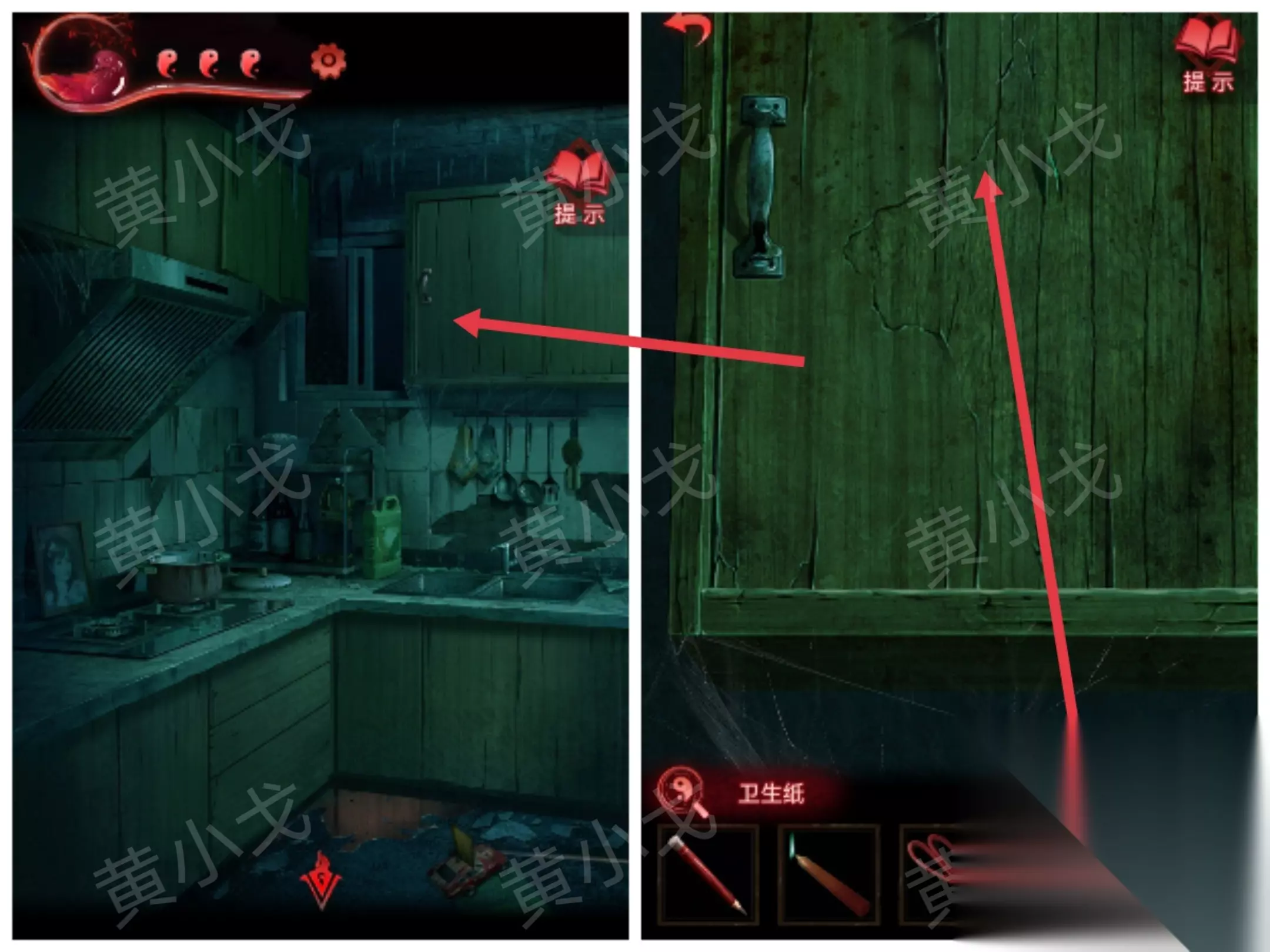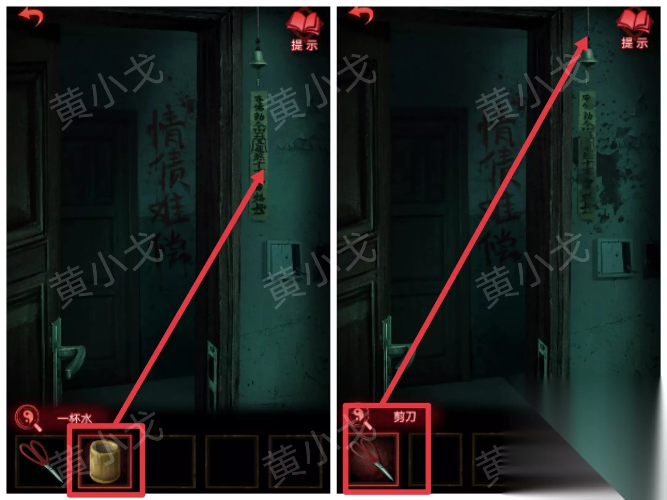 ……✄……✄……✄……✄……✄…… [客厅左] 35.用【一杯水】泼门旁边的咒符,用【剪刀】剪掉铃铛,出门,触发剧情