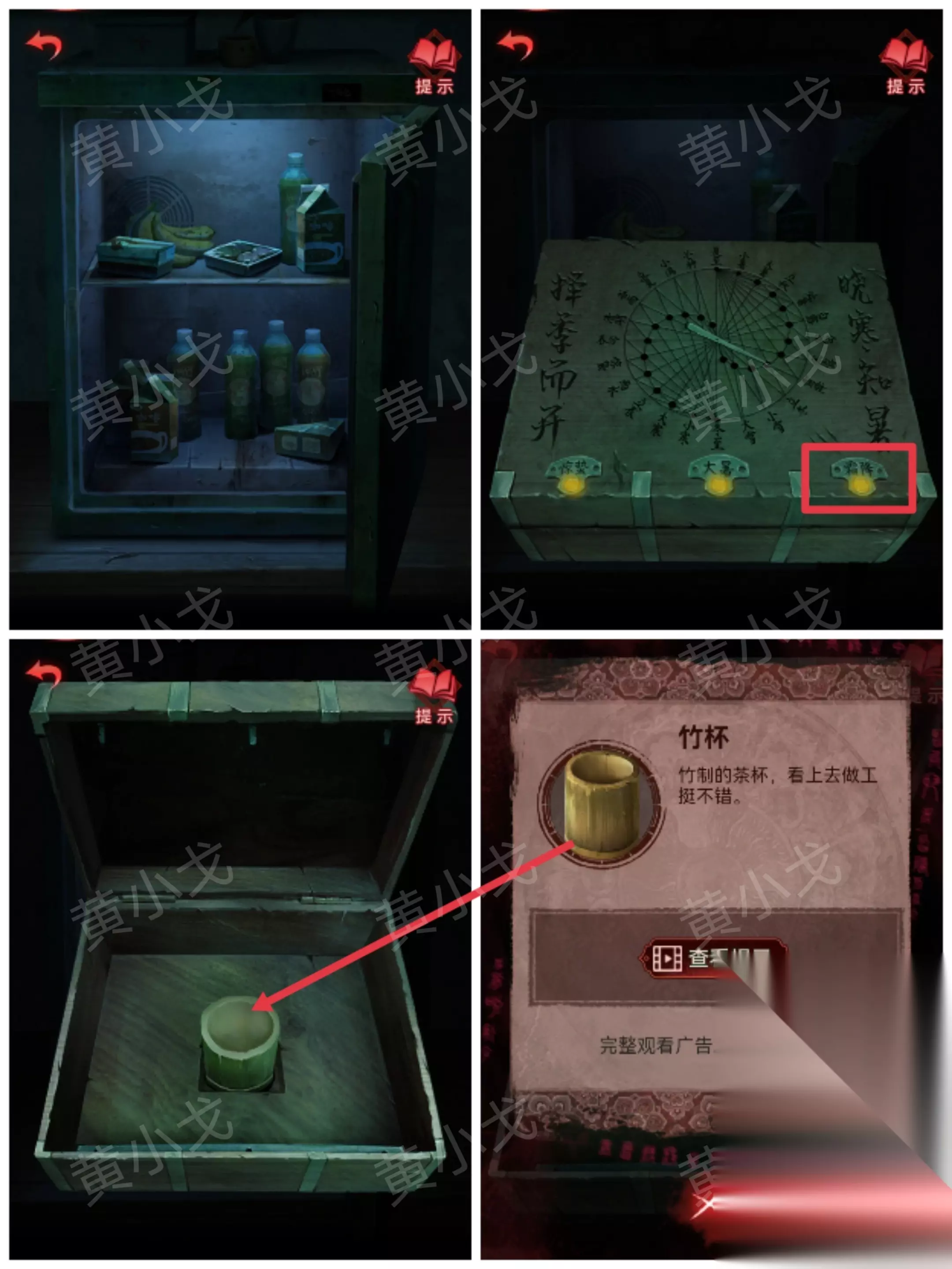 33.点击冰箱,放入【二十四节气盒子】,霜降按钮亮起;打开盒子,获得【竹杯】