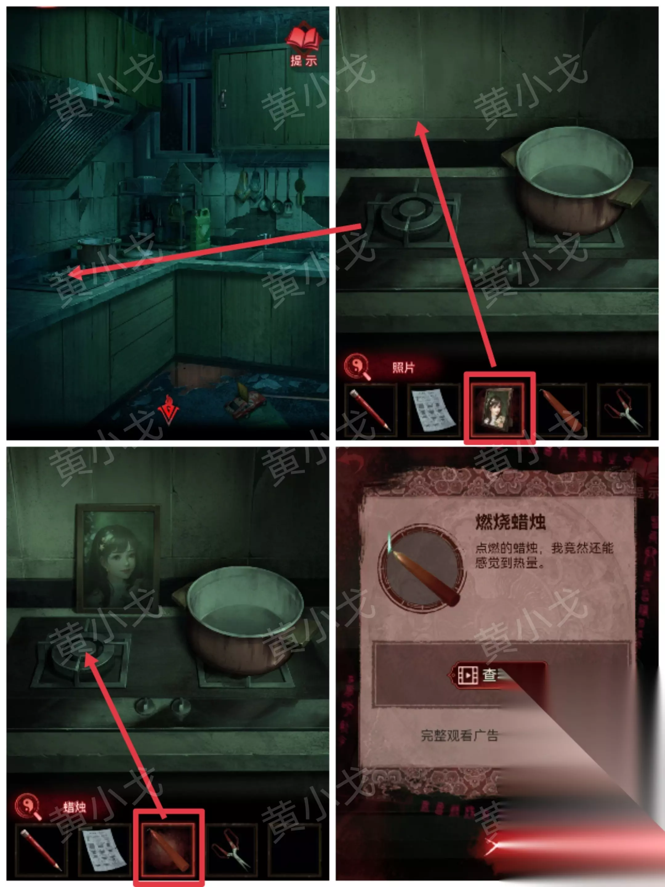……✄……✄……✄……✄……✄…… [厨房] 22.点击灶台,摆上【照片】,用【蜡烛】点火,获得【燃烧蜡烛】