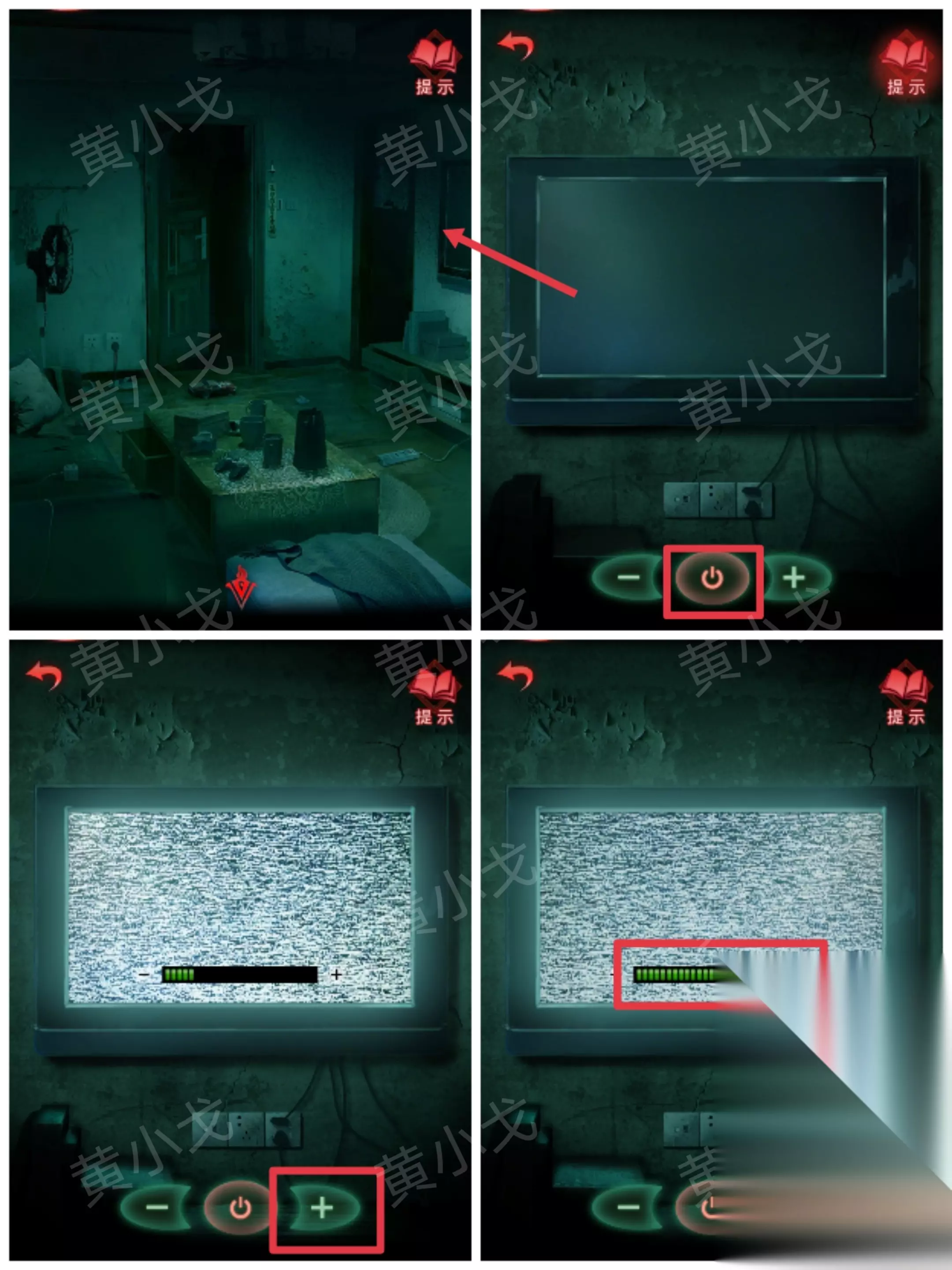 ……✄……✄……✄……✄……✄…… [客厅左] 17.点击电视,打开,将声音调到最高,走廊声控灯亮起