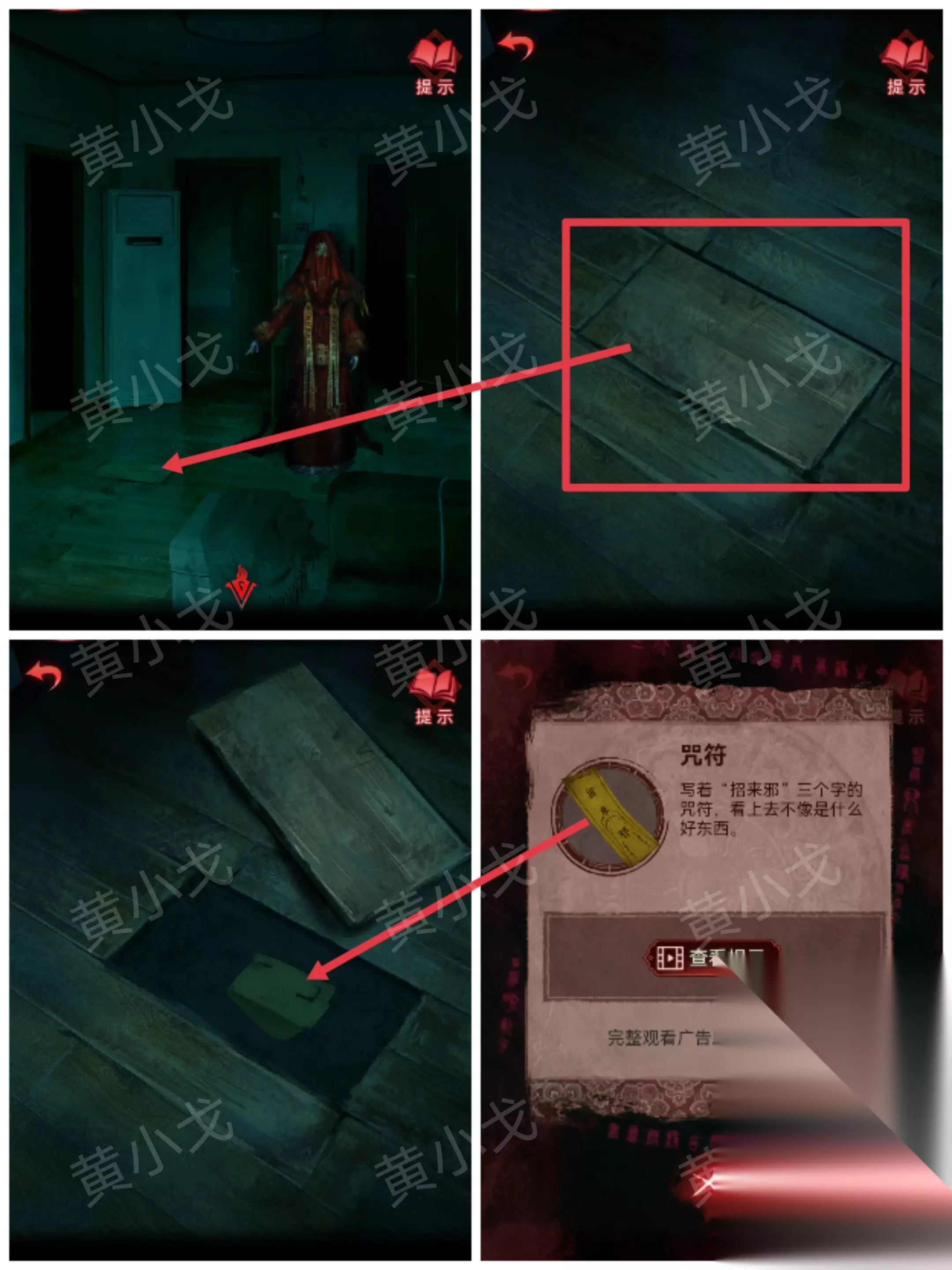 ……✄……✄……✄……✄……✄…… [客厅右] 6.根据新娘纸人的提示打开地板暗格,获得【咒符】
