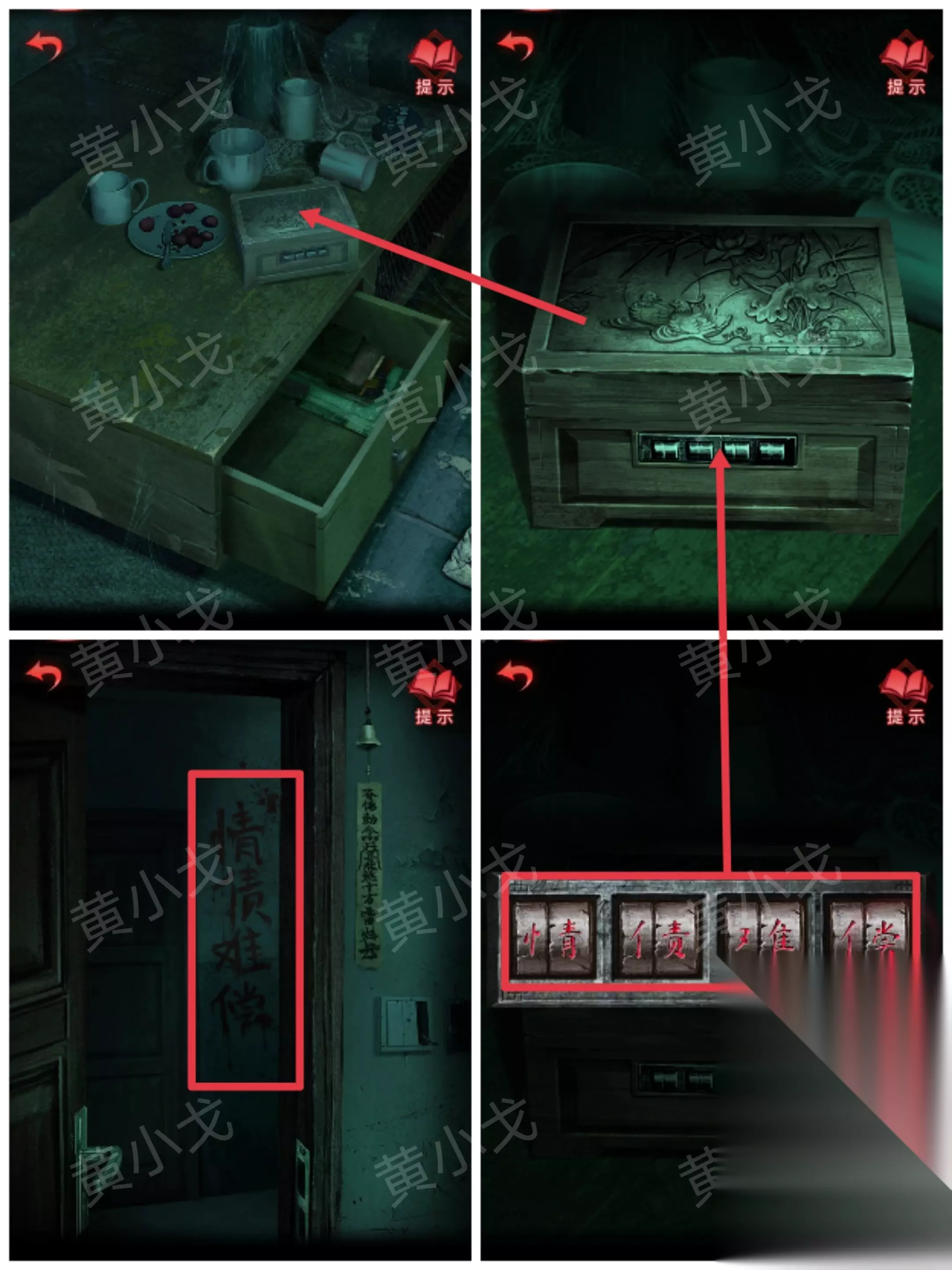 19.点击茶几上的盒子,根据走廊墙上的字,调整密码锁 情债难偿