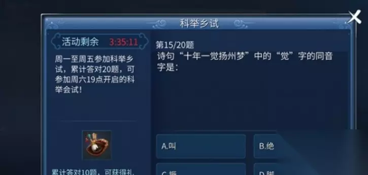 每周六晚上7点,倩女幽魂游戏将开启激动人心的科举会试。在这个活动中,玩家们将迎来一场挑战,通过评价快速答题和准备回答问题,有机会跻身排名前10,进而参加晋级科举殿试,展示自己的才华与智慧。对于新手玩家而言,可能对科举会试的答案不太了解。为此,小编特地整理了科举会试答题的正确答案,为玩家提供参考。这份答案清晰明了,帮助玩家更好地应对考验,确保他们能够在竞争激烈的科举殿试中脱颖而出。倩女幽魂游戏为玩家们精心设计了这个富有趣味性和挑战性的活动,通过参与科举会试,不仅能够锻炼智力,还能结识更多游戏中的伙伴。对于那些渴望在游戏中展现自己才情的玩家来说,这是一个展现实力的绝佳机会。如果你还未了解科举会试答案,赶紧查看小编整理的内容,为自己的游戏之路增添一份精彩。