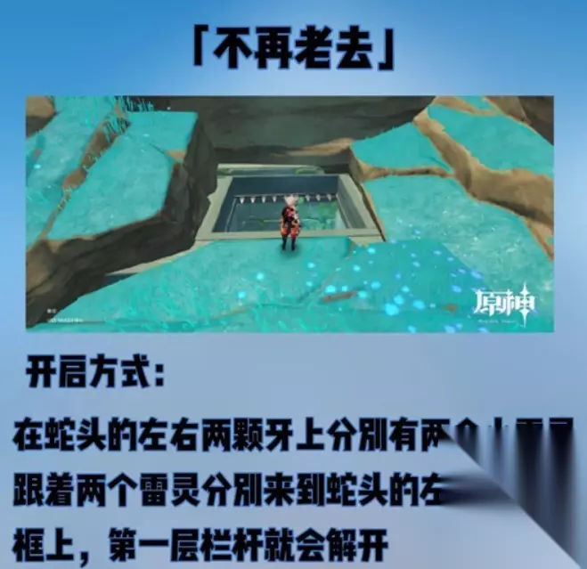 ⓶第二块墓碑 传送到七天神象,往绯木村方向走,在山崖底的角落里 ⓷第三块墓碑 在蛇神之首下面的洞穴最底部 注:如果还没有开启,就照我方式开启门闸 开启方法 •在蛇头的左右两颗牙上分别有两个小雷灵,跟着两个雷灵分别来到蛇头的左右两个眼框上,第一层栏杆就会解开 •闸门开启后,里面会有三层空间,飞下第一层打开第二层栏杆的开关,然后第二层会有一个解密 •右边的开关是重置顺序的。左边这四个开关按顺序打开即可。打开后我们就可以飞下第三层,墓碑就在下面。