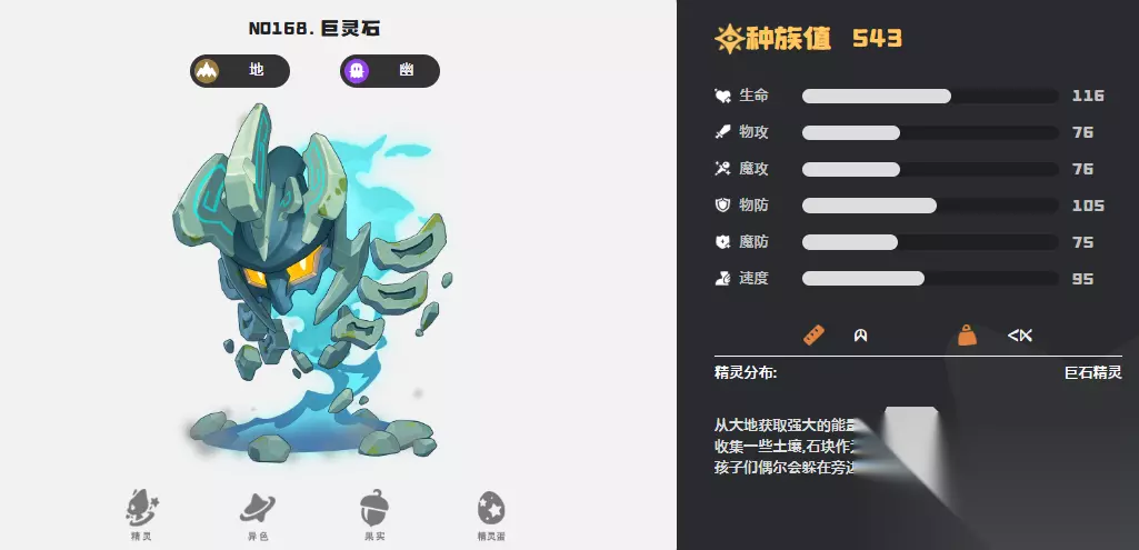 另一种特殊组合是幽灵+地面系的巨灵石。该精灵拥有独特的能量差反制机制:当其技能消耗的能量高于对手时,在行动结束后会扣除双方的能量差值,这一设定可用于限制高耗能技能的频繁使用,形成有效的控场效果。而在高编号精灵中,寂灭骨龙尤为引人注目。作为幽灵+龙系的双属性精灵,它由大头古龙进化而来,具备每6回合自动复活一次的能力,极大提升了队伍的容错率与翻盘潜力,常被用作主力承伤单位。