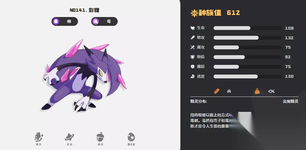 此外,游戏中还存在多种幽灵系与其他属性融合的精灵。例如忽幽狸,属于幽灵+毒系的双属性组合。它在进化后成为影狸,继承并强化了原有的双重属性优势。其“黑手”特性可在敌方入场时自动施加中毒状态,实现持续伤害输出。配合减益类技能,影狸能在持久战中逐步瓦解对手的战斗节奏,非常适合打消耗战的战术体系。